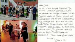 Danke danke danke für die wunderbare Kinderbetreuung bei unserer Hochzeit! Ich konnte es kaum glauben aber ich hab wirklich die ganze Zeit fast keines der Kinder gesehen.. 😁 Und wir Eltern waren regelrecht abgeschrieben. Es wurde eine großartige Spielecke aufgebaut und die Schatzsuche hat den Erzählungen der Kindern nach (ich hab ja nichts mitbekommen :)) einen riesen Spass gemacht und war ein besonderes Highlight! Ich überlege jetzt schon bei welcher der nächsten anstehenden Feiern ich euch wieder buche! Herzlichen Dank an Jenny, Max und Sylvie für die tolle Erfahrung mit euch!