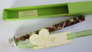 Meine Produkte erstelle ich mit Papier, Stempeln und Textdruck am PC. Mein "besonderes" Produkt ist die Einladung im Reagenzglas, die den Gästen schon beim Auspacken der Einladung Vorfreude aufs Fest bereitet.