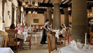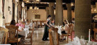 Restaurant, Gewölbekeller oder Veranstaltungssaal mit festlich eingedeckten und dekorierten Tischen