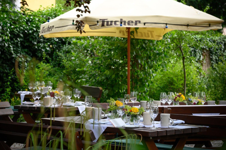 Ein herrlicher Garten, umsäumt von altem Baumbestand, aufmerksames Servicepersonal, das Ihre Gäste verwöhnt, kulinarische Köstlichkeiten,
