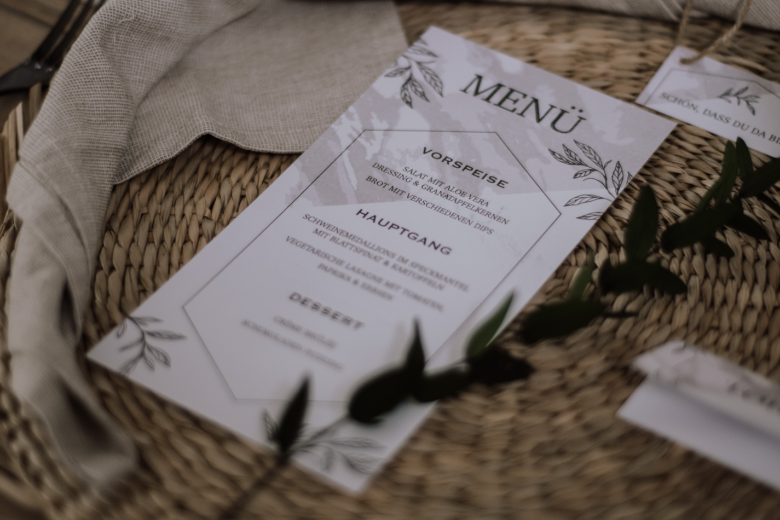 Papeterie Designvorlage nach Wahl (50er Set): - Save-the-Date Karte - Einladung - Menükarte - Namenschilder - Tischkarte - Geschenkanhänger - Danksagung