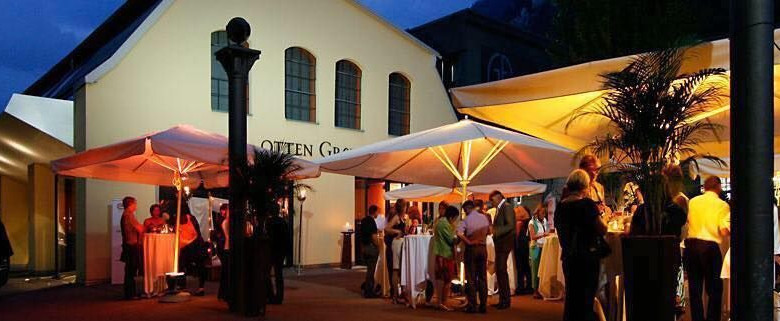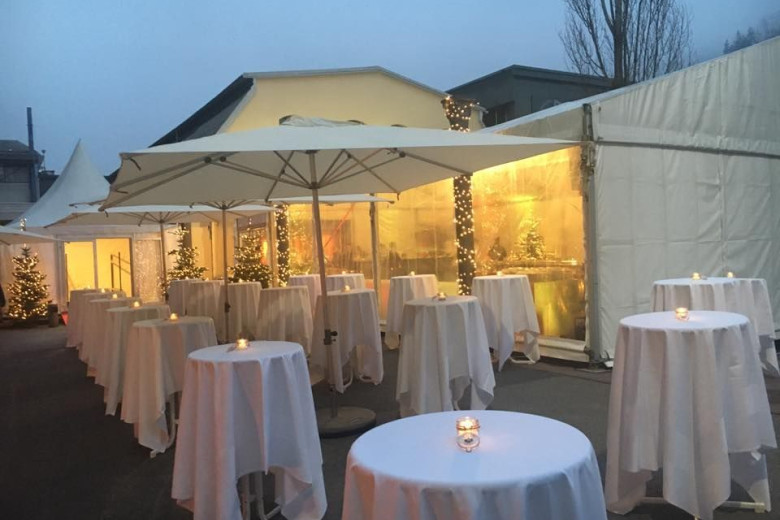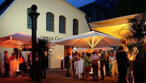 Die Gäste werden auf dem Vorplatz unter großen Sonnenschirmen mit einem Aperitiv oder Glas Sekt empfangen.