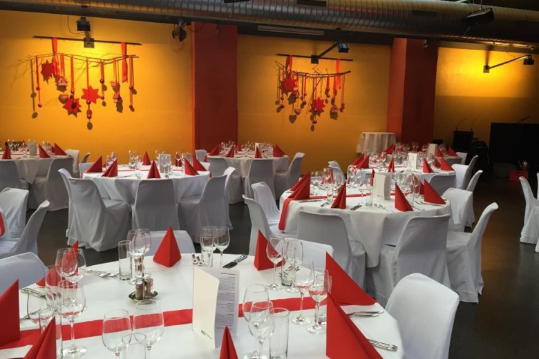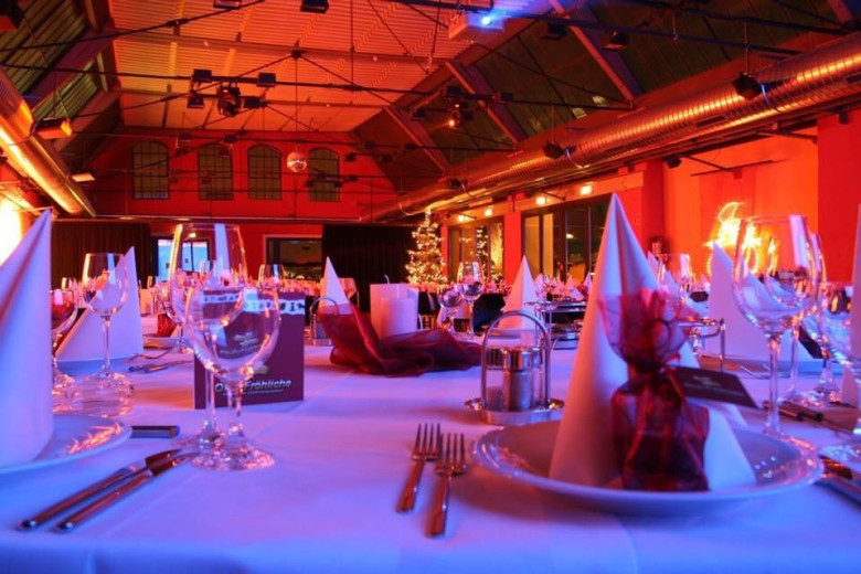 Auf der Bühne spielt eine Band und besondere Programmeinlagen werden von der umfangreichen Eventtechnik der Location unterstützt.