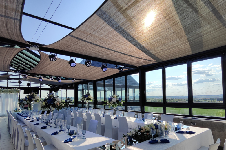 Dank der vielen kombinierbaren Ebenen und Bereiche lässt sich die Pyramide an jedes Hochzeitskonzept von 50 bis über 600 Personen anpassen. Ob Verlobung, Trauung oder Hochzeitsfeier mit gemeinsamen Essen müssen sie die Location nicht wechseln.