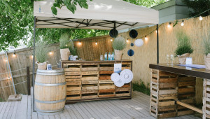 Selbstverständlich dürfen eisgekühlte Drinks nicht fehlen: Die private Bar versorgt die Gäste mit Getränken, während der Duft eines reichhaltigen Buffets herüberweht.