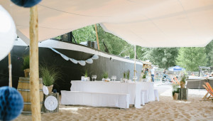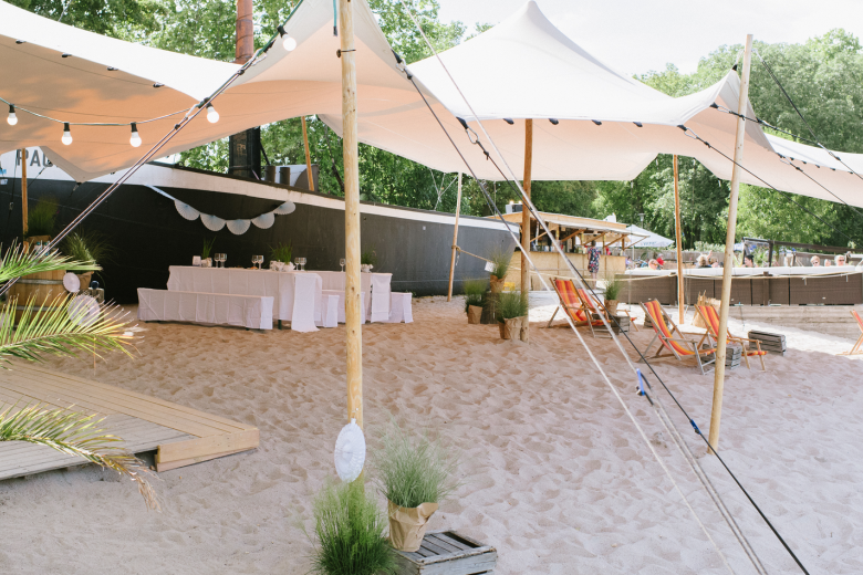 Durch das große Stretchzelt und dem Sand auf dem gesamten Gelände kommt Strandfeeling auf – fast wie im Urlaub.