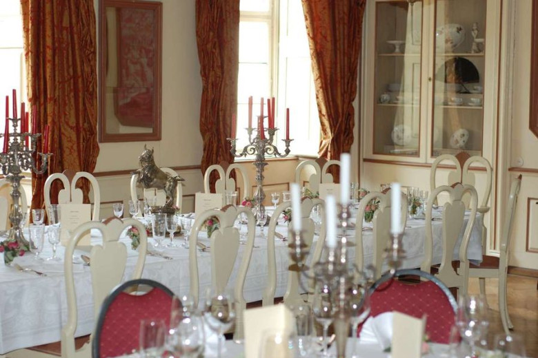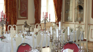 Auf Schloss Sandizell bieten sich Ihnen im Einzelnen folgende Möglichkeiten: Standesamt im eleganten Großen Salon (30 Sitzplätze, 330 € Miete / mit Sektempfang zzgl. 165 €). Terminvereinbarung zusätzlich mit Standesamt Schrobenhausen unter Tel. 08252/90-0 erforderlich, das die Trauung dann durchführt. Kirchliche Trauung in der privaten Schlosskapelle (35 Sitzplätze, 330 € Miete) oder der katholischen Pfarrkirche neben dem Schloss (ca. 250 Sitzplätze, separate Terminvereinbarung über Pfarrei Langenmosen Tel. 08433/358) Feiern im Roten, Rosa und Blauen Salon (bis 80 Personen 2.200 €, bis 120 Personen 2.750 € Miete) oder alternativ in der rustikalen Eingangshalle (bis 80 Personen, 990 € Miete), dem Rittersaal (bis 60 Personen, 1.650 € Miete) oder dem Steinsaal (bis 45 Personen, 990 € Miete). Zusätzlich kostenfreie Nutzung des Innenhofs und Schlossparks bei schönem Wetter. Hier kann gegebenenfalls ein Zelt im Innenhof aufgestellt werden. Die Platzmiete beträgt in diesem Falle zusätzlich 220 €. Bei mehr als 120 Gästen kann ein Zelt im Schlosspark aufgestellt werden. Die Platzmiete beträgt 1.650 € (Das Zelt muss vom Mieter organisiert und separat bezahlt werden). Alle Preise verstehen sich inkl. Nebenkosten für Feinreinigung und Strom/Wasser sowie zzgl. MwSt.