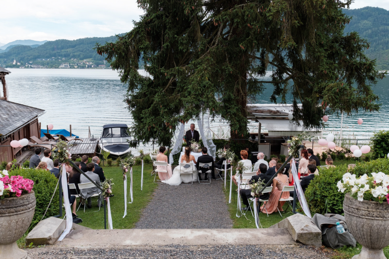 Seit über 125 Jahren thront die Schlossvilla, ein Juwel der Wörthersee-Architektur, in der bezaubernden Ostbucht von Pörtschach, direkt am Ufer des türkisblauen Wörthersees. Sie bietet wahrlich alles, was man sich von einer Location erträumt: Ungestörte Privatsphäre, einzigartige Lage, einen großzügigen Park, Exklusivität, erlesene Kulinarik. Der Standesbeamte kommt ins Haus, die Kirchen von Maria Wörth und Dellach sind mit dem Schiff direkt von der hauseigenen Anlegestelle aus erreichbar.