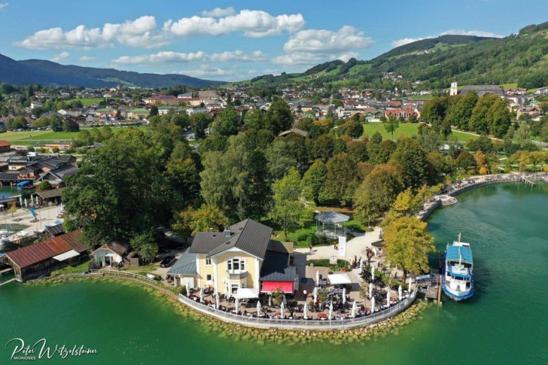 Zum Empfang bietet sich die Anlegestelle der Mondseeland direkt am See bestens an.