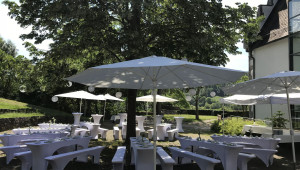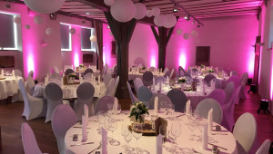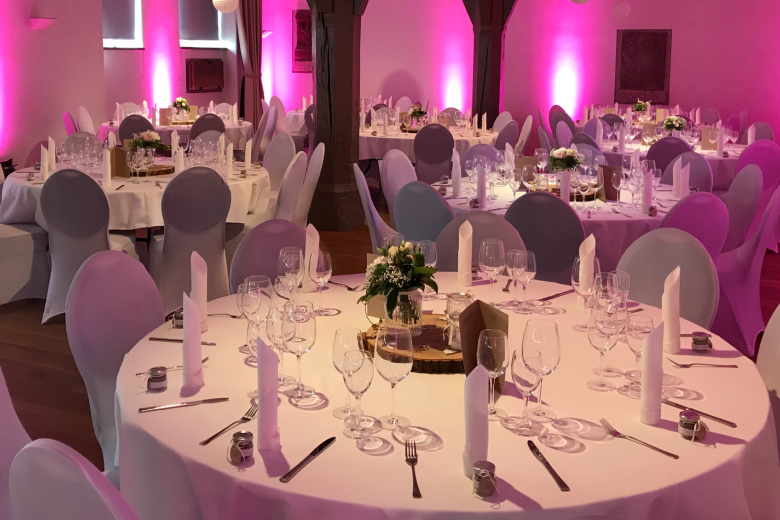 Wir bringen die Atmosphäre in eure Location. Für die freie Trauung platzieren wir die weißen Stühle und rollen den weißen Teppich aus. Für ein schattiges Plätzchen stellen wir Sonnenschirme auf oder spannen ein Segel. Zum Dinner dürft ihr an runden Tischen auf weißen Stuhlhussen sitzen. Wenn’s dunkel wird tauchen wir eure Location in traumhafte Farben und knipsen die Lichterketten an.