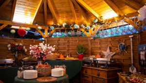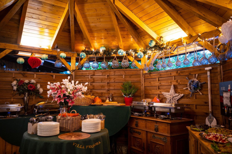 Sie können einige Dinge, wie Dekoration, Teile des Buffets, DJ, Künstler, Spirituosen selbst beisteuern. Wir stellen mindestens die Location, die Getränke, das Personal.