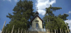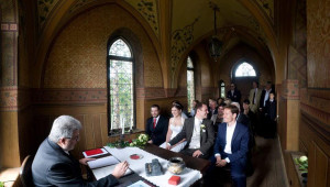 Die reichhaltig mit Ornamenten verzierte Wandbemalung, stilechte Bleiverglasung und dazu passendes antikes Mobiliar der Kapelle bilden einen romantischen Rahmen für die Zeremonie. Der Raum bietet 15 Sitzplätze und einige Stehplätze. Für alle weiteren Gäste wird die Trauung auf Bildschirme nach draußen übertragen. Nach dem Eheversprechen treten Sie aus dem liebevoll dekorierten Eingangsportal vor die Festgesellschaft.