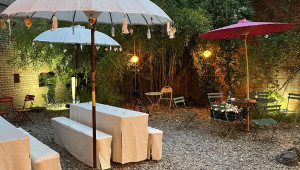 Hinzu gehört ein schöner Vorgarten-Bereich, der sich wunderbar für einen Hochzeitsempfang oder kleinere Programmpunkte gestalten lässt. Wer die Location betritt, sieht bereits den innenliegenden Bambusgarten, der sich individuell für alle Feierlichkeiten gestalten lässt. Die Innenräume sind miteinander verbunden, ohne trennende Türen. Im vorderen Raumteil ist eine Küche mit beweglicher Kochinsel vorhanden. Von hier gibt es einen weiteren Ausgang zum Garten. Der hintere Raum ist über eine kleine Stufe von ca. 10 cm erreichbar. Geheizt wird im Winter mit zwei Holzöfen sowie zusätzlichen Marmorsteinplatten.